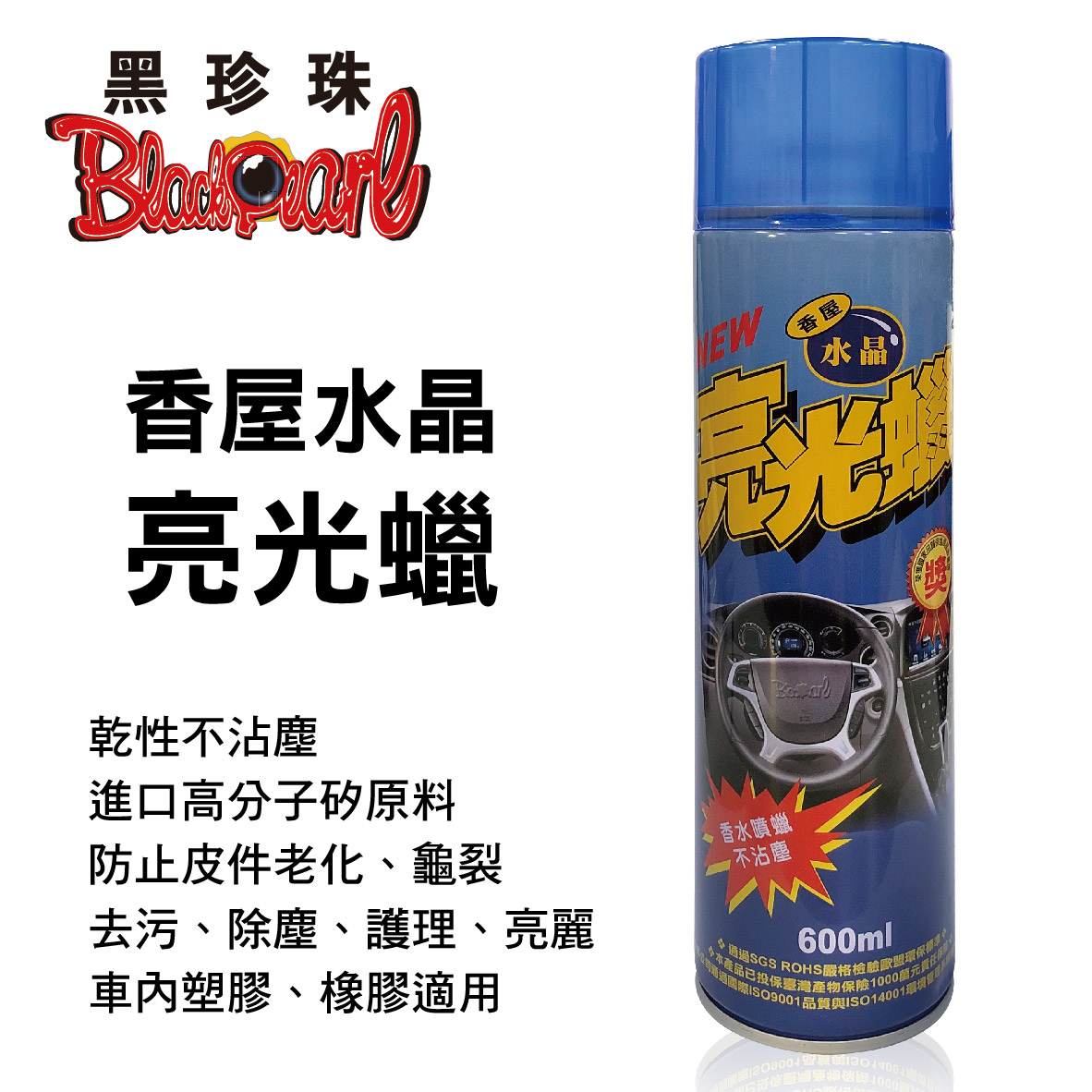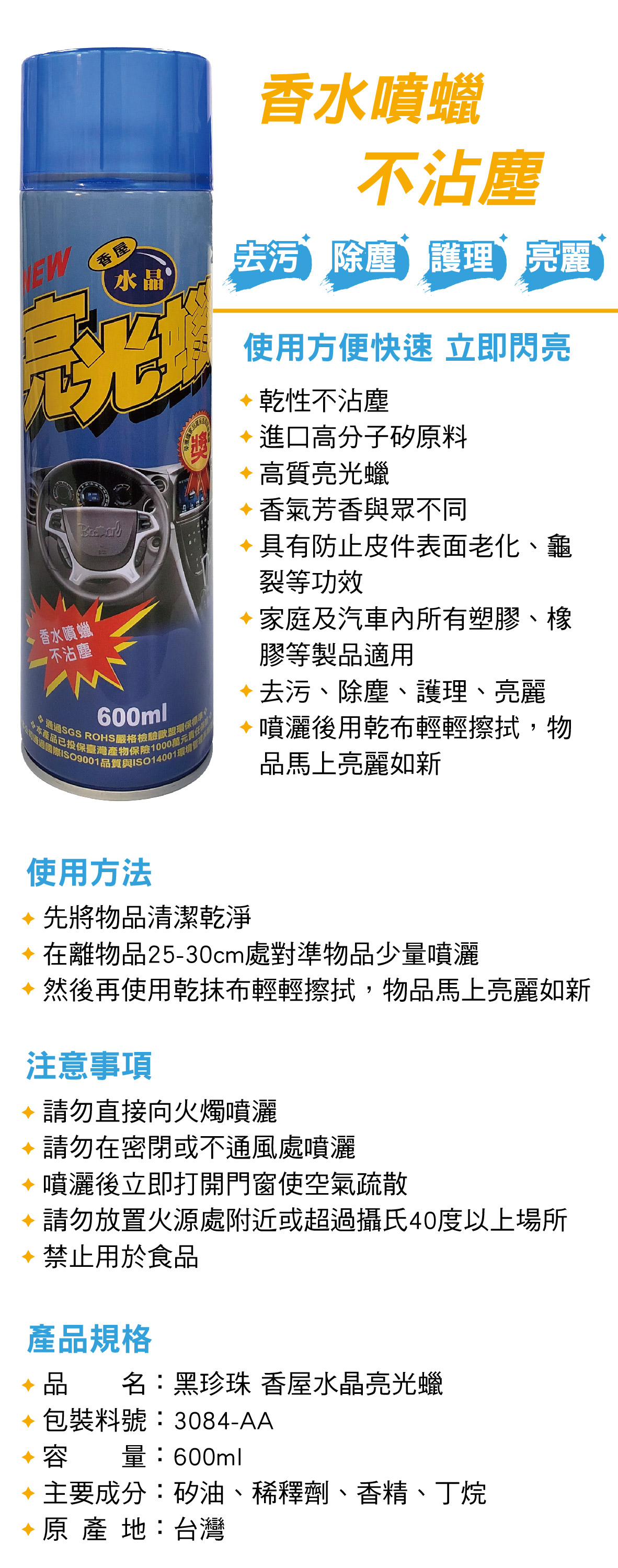 (1)乾性不沾塵 進口高分子矽原料 (2)高質亮光蠟,香氣芳香與眾不同 (3)具有防止皮件表面老化、龜裂等功效 (4)適用家庭及汽車內所有塑膠、橡膠等製品 (5)去污、除塵、護理、亮麗 (6)噴灑後用乾布輕輕擦拭,物品馬上亮麗如新