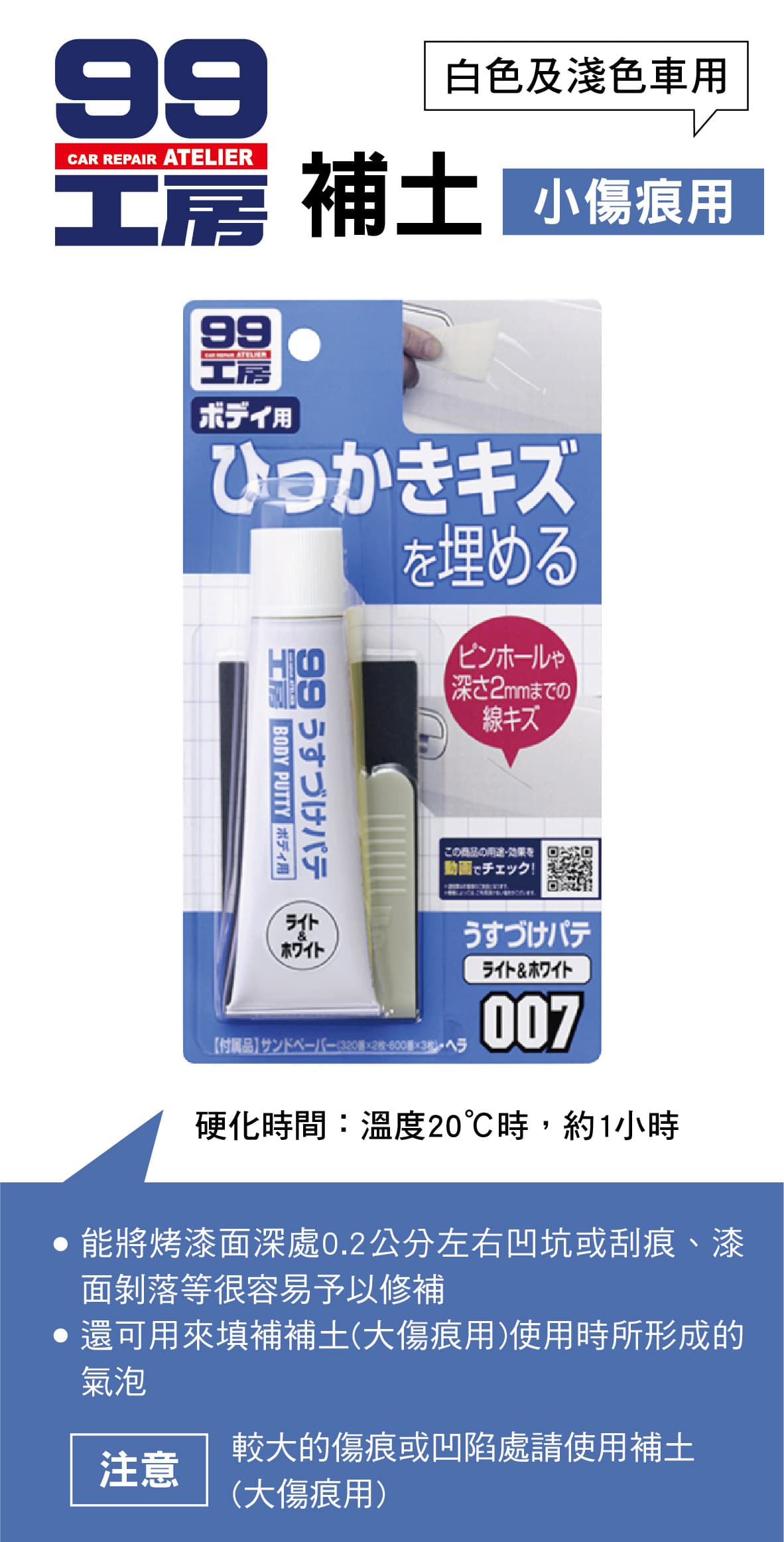 (1)能將烤漆面深處0.2公分左右凹坑或刮痕、漆面剝落等很容易予以修補 (2)還可用來填補補土(大傷痕用)使用時所形成的氣泡 ※注意:較大的傷痕或凹陷處請使用補土(大傷痕用) (3)硬化時間:溫度20℃時,約1小時 (4)作業輕鬆簡單,效果顯著,不易剝落