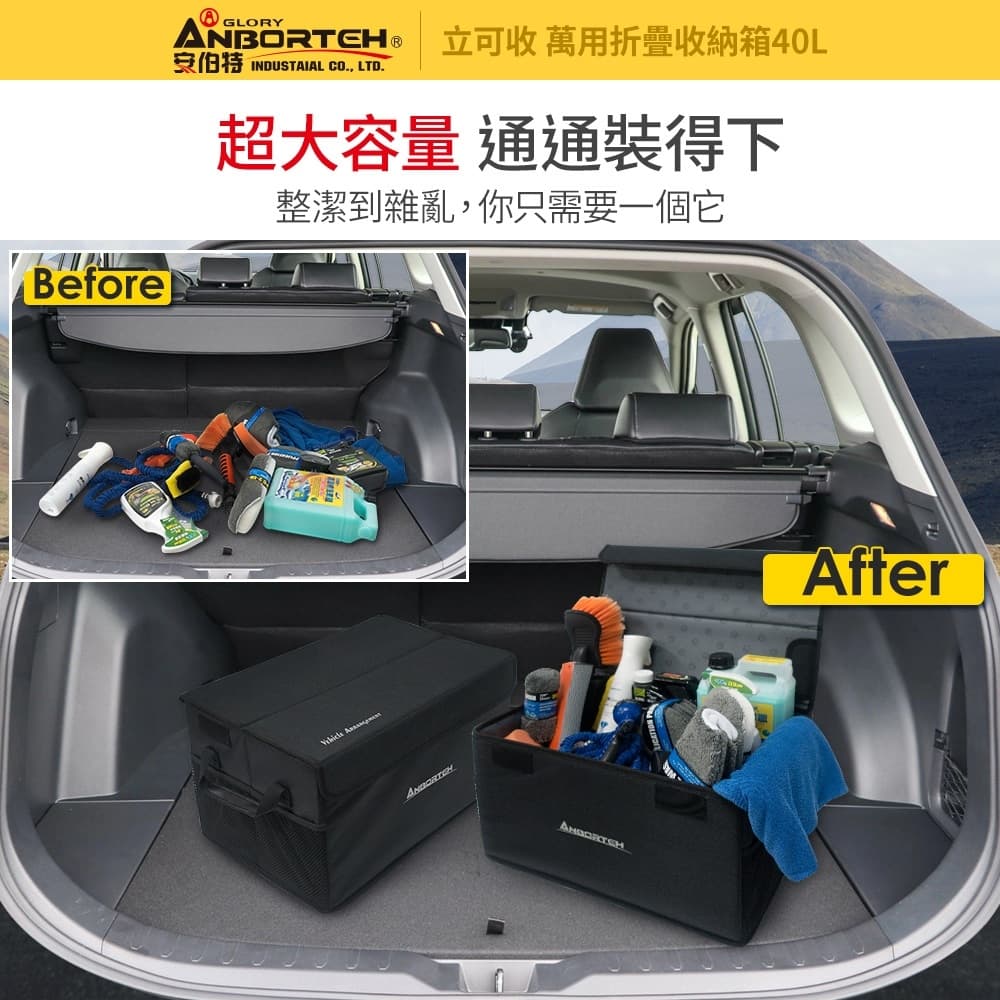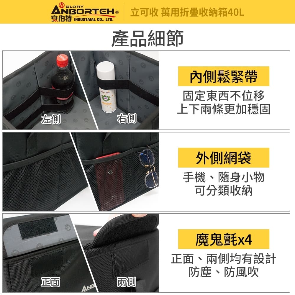 (1)40L超大容量好收納,讓愛車的後車箱整潔乾淨 (2)可摺疊省空間,收納後體積縮小5倍,不佔空間 (3)防水牛津布、高密度PP支撐板、優質植絨內裡,耐磨防刮且耐用 (4)1680D超厚實雙股牛津布,具有極高的密度及防水性 (5)內側鬆緊帶設計,固定東西不位移 (6)外側網袋,手機、隨身小物可分類收納 (7)正面、兩側均有魔鬼氈,可防塵、防風吹 (8)防水材質,可直接水洗 (9)提把設計,搬運輕鬆 (10)附底板、四周內層硬度加強