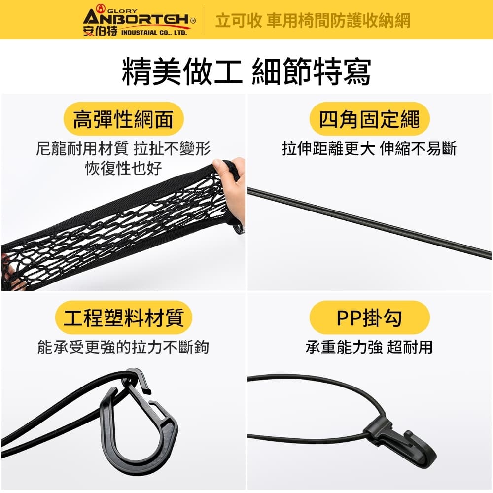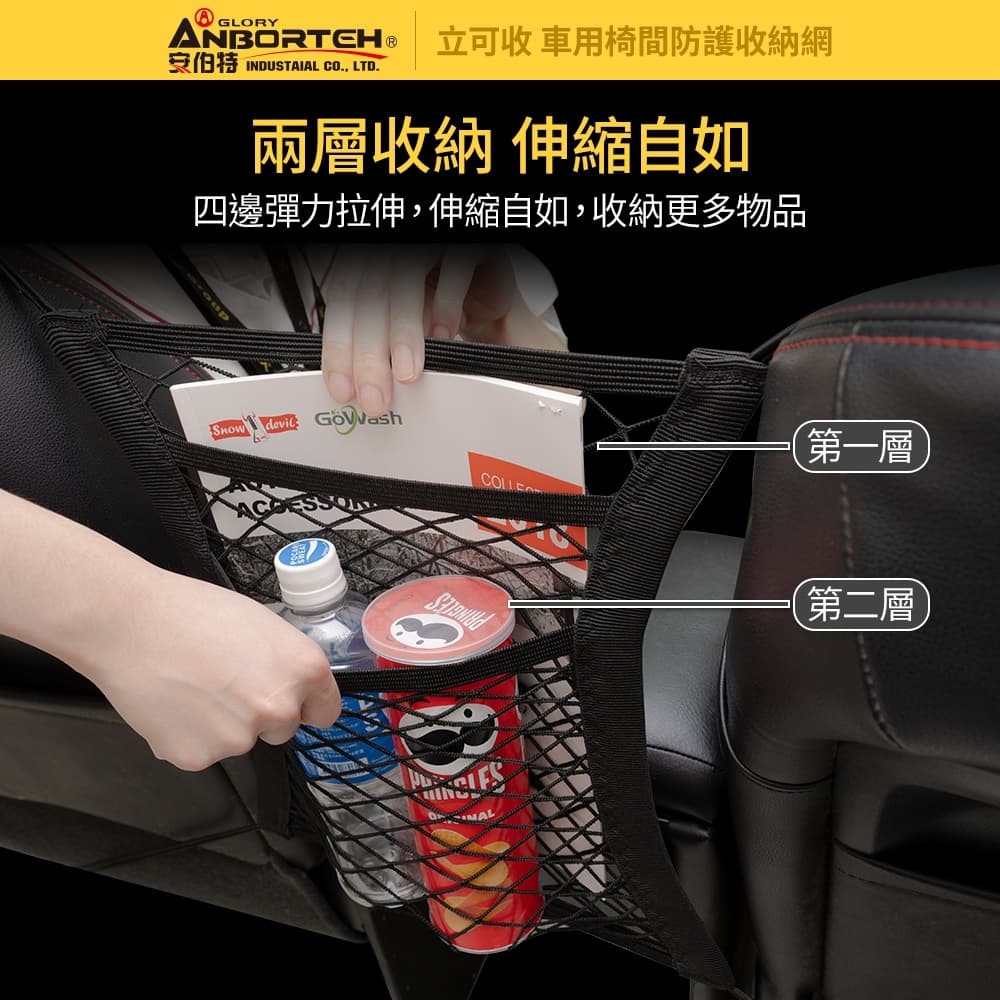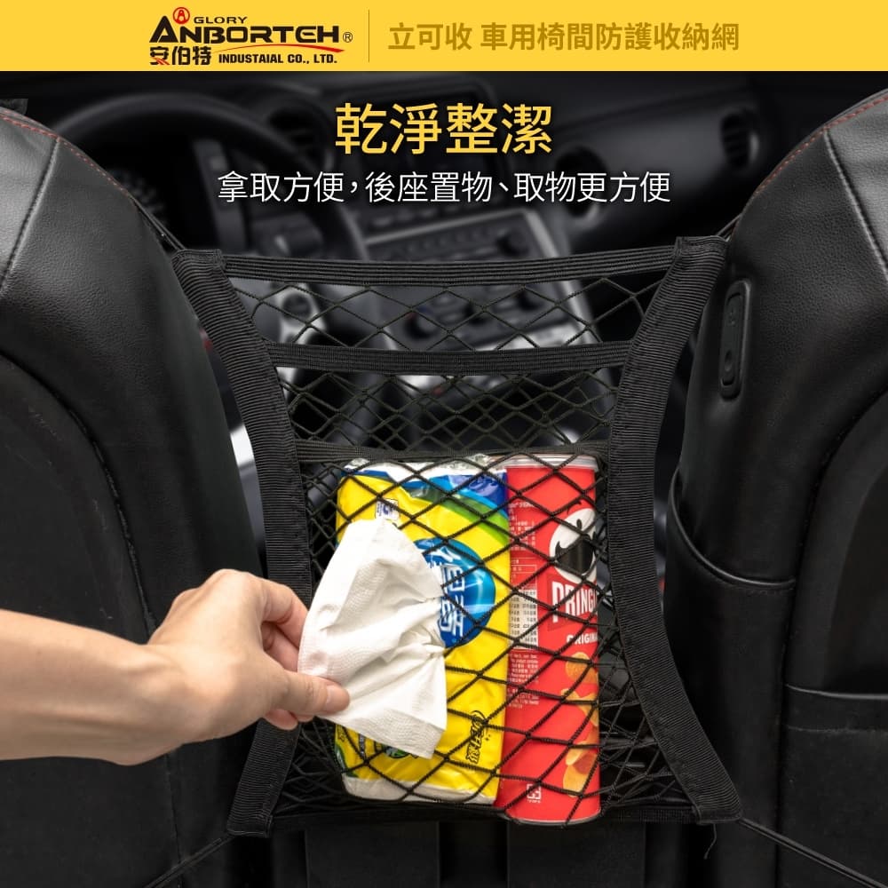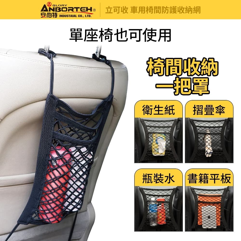 (1)拿取方便,後座置物、取物方便 (2)兩層收納,四邊彈力拉伸,伸縮自如,收納更多物品 (3)扶手箱上可放置物品,不因路況而後滑,簡單實用 (4)軟性隔檔,不讓寵物或小孩向前影響前座駕駛 (5)單座椅也可使用,收納衛生紙、摺疊傘、瓶裝水、書籍平板等 (6)尼龍耐用材質,拉扯不變形,恢復性也好 (7)工程塑料材質,能承受更強的拉力不斷鉤 (8)PP掛勾,承重能力強、超耐用