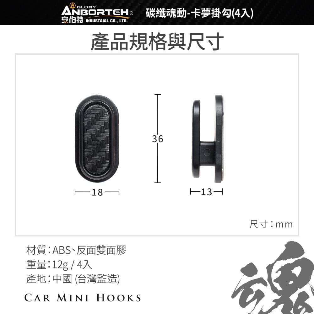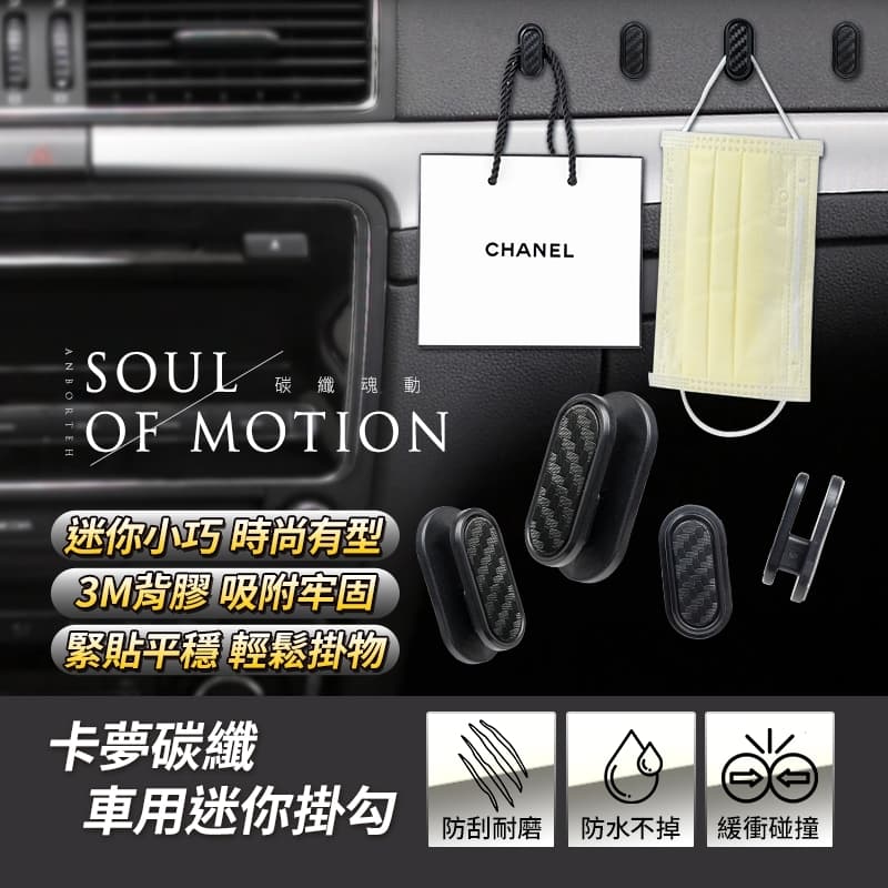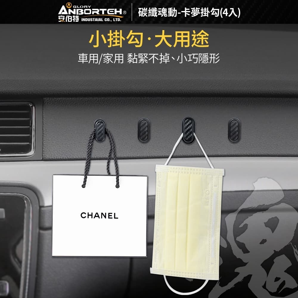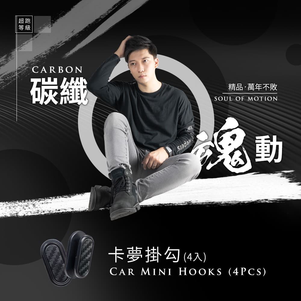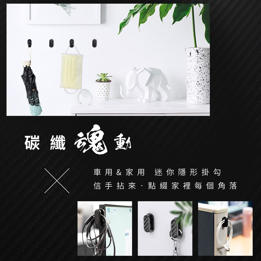 (1)迷你小巧、3M背膠、吸附牢固 (2)進口3M背膠,撕除無殘膠,可黏貼於各種材質 (3)緊貼平穩、輕鬆掛物 (4)車用/家用,黏緊不掉、小巧隱形 (5)碳纖卡夢款,與內飾融為一體,是掛勾也是裝飾品