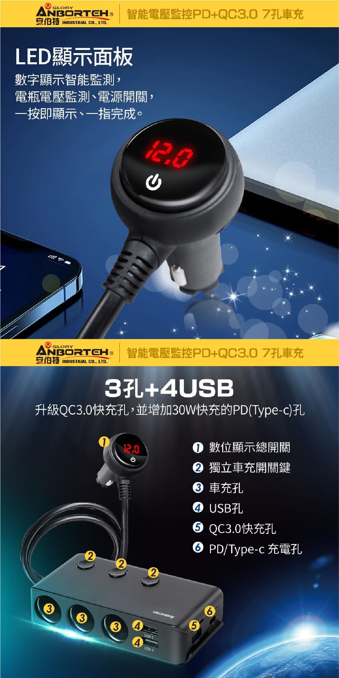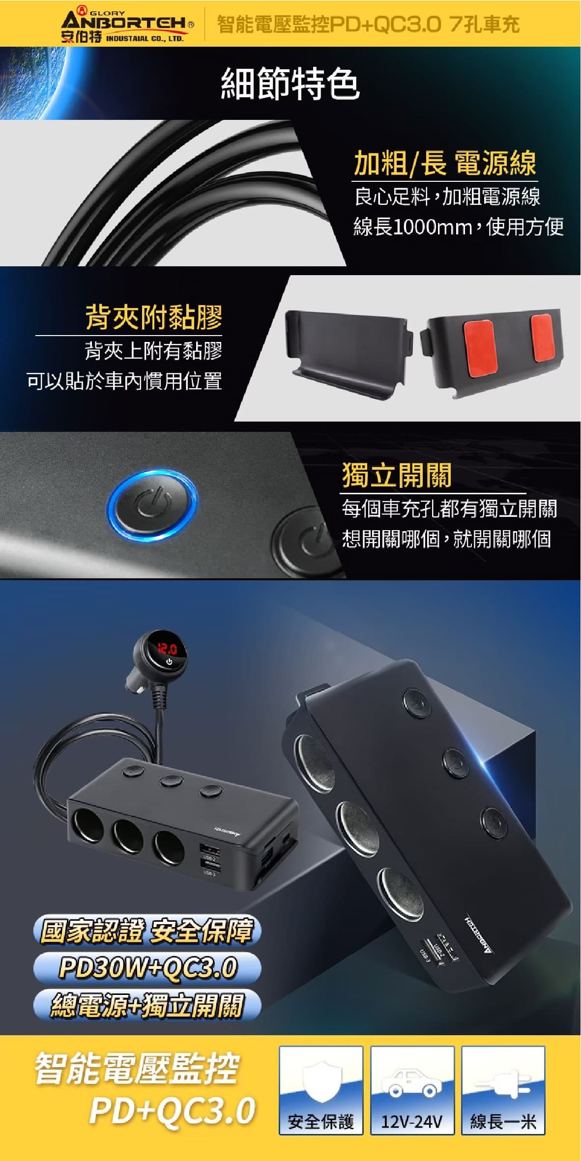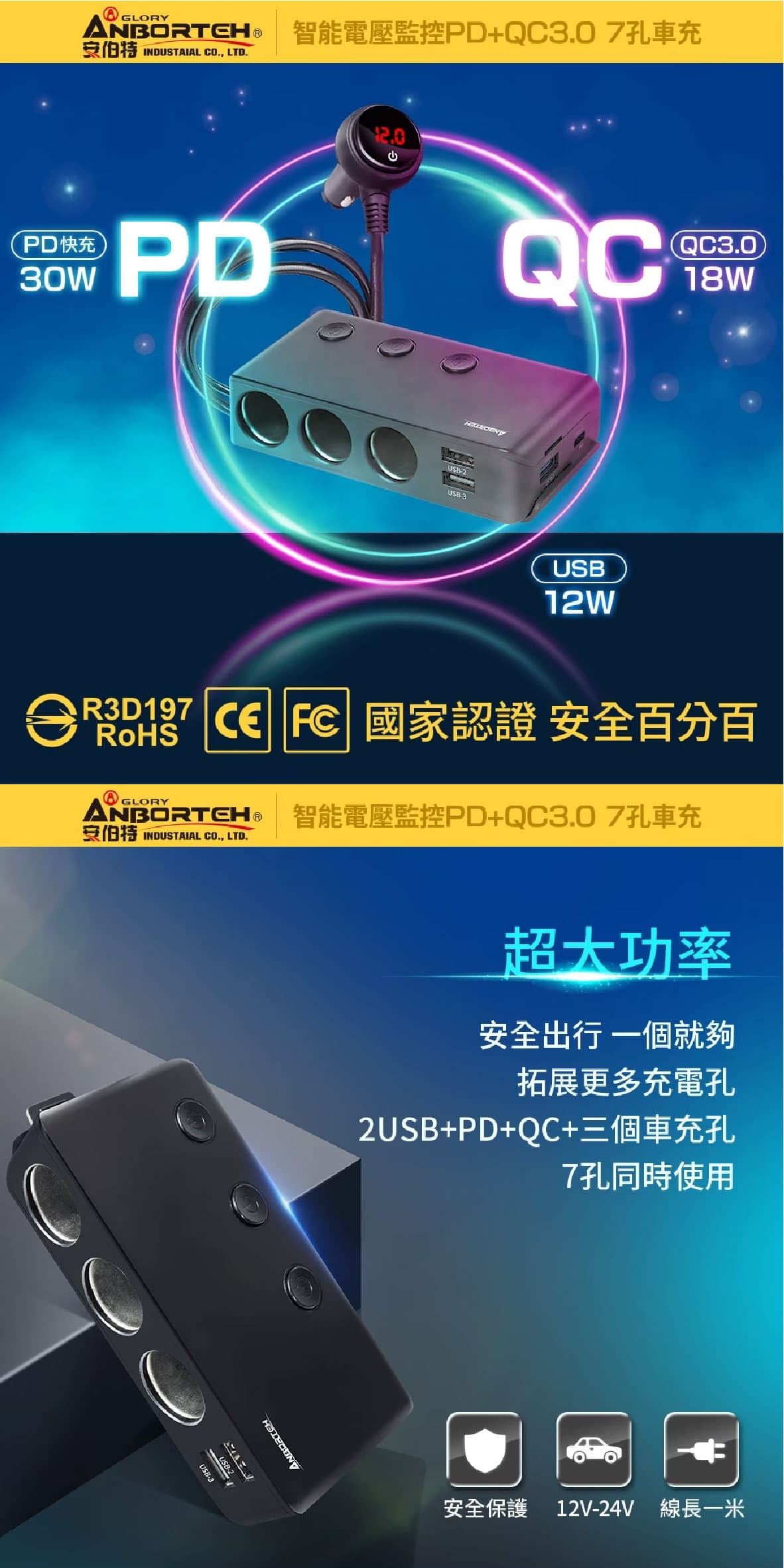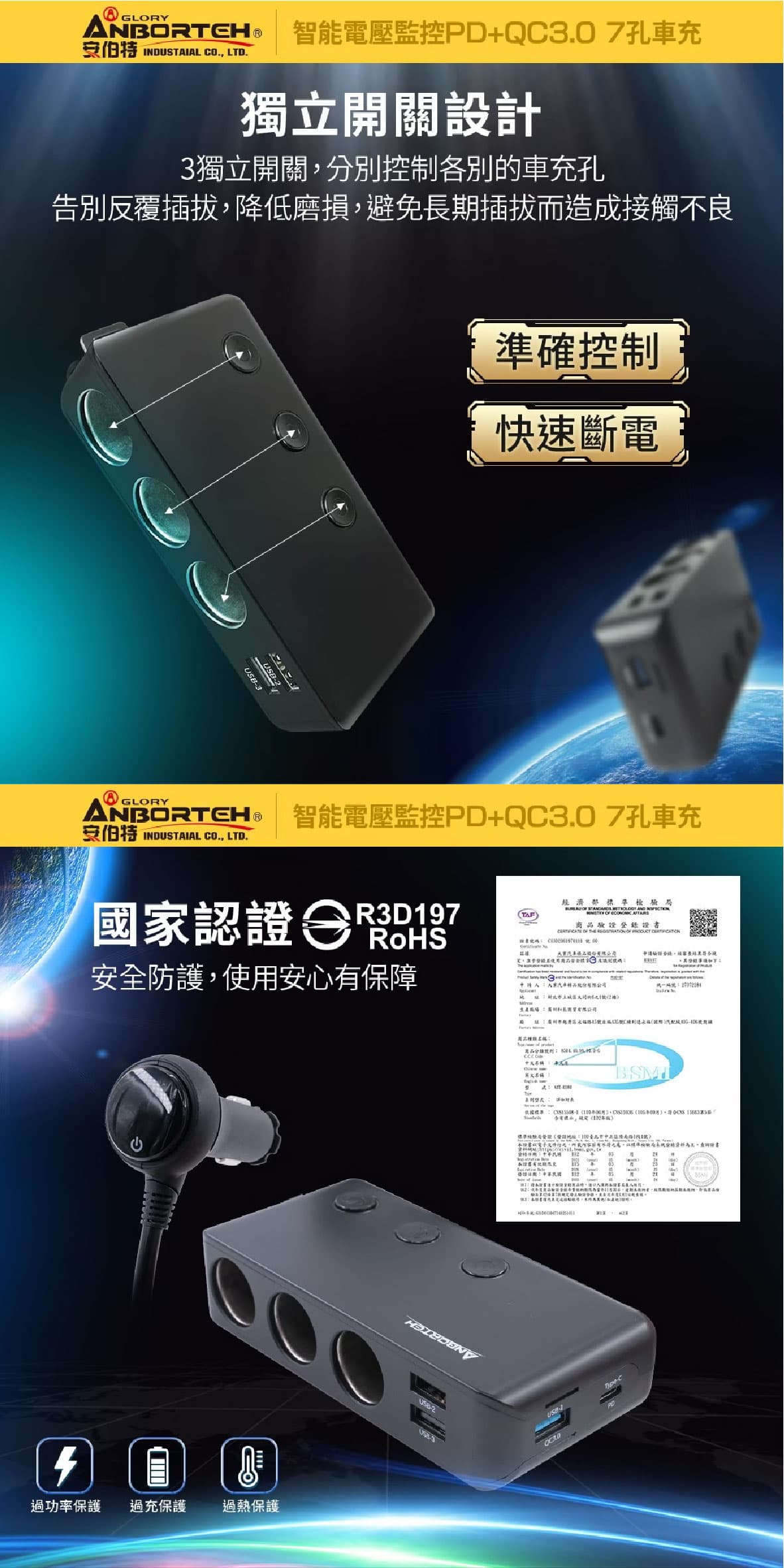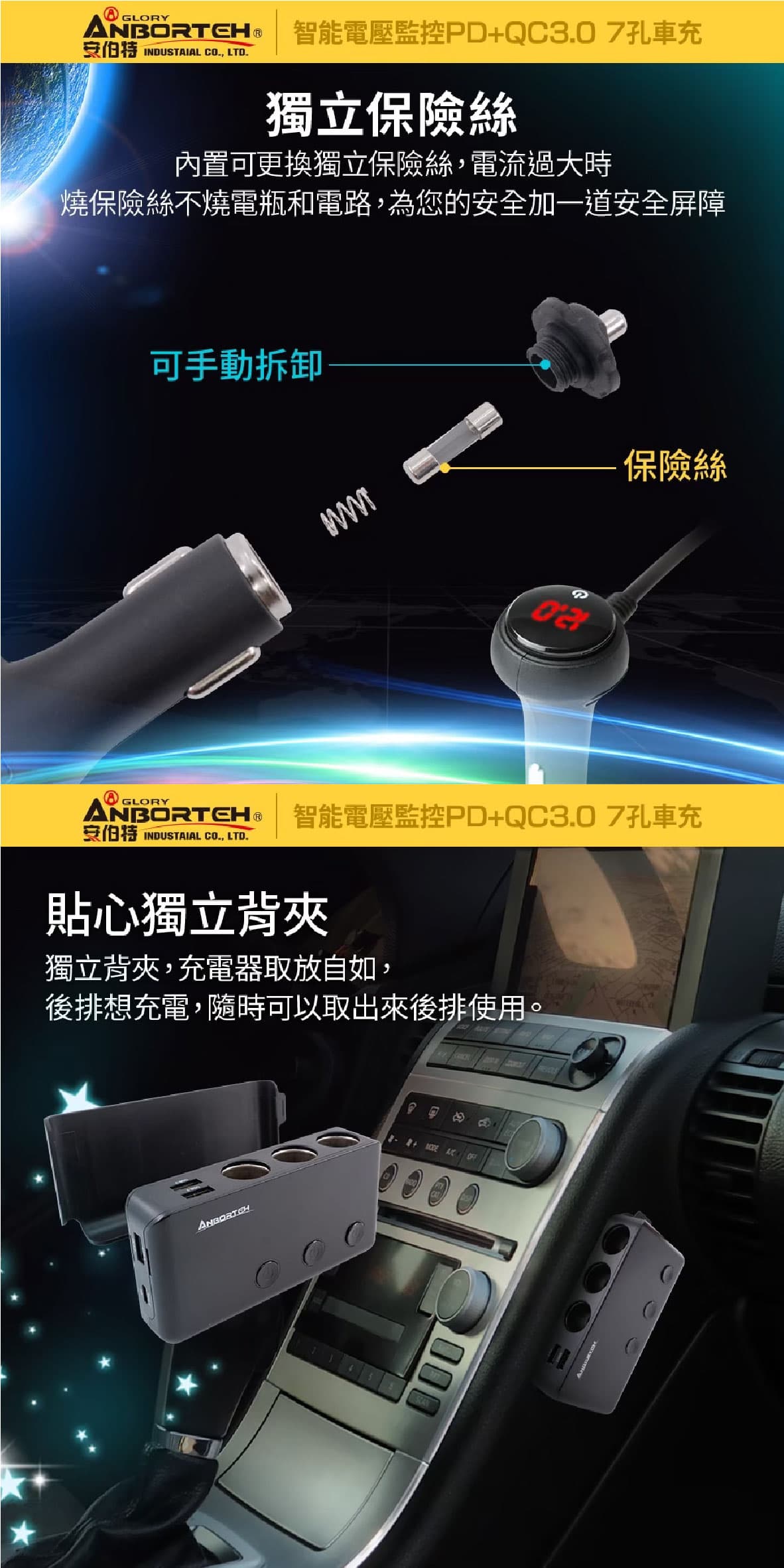 ‧LED顯示面板 數字顯示智能監測,電瓶電壓監測、電源開關,一按即顯示、一指完成 ‧3孔+4USB 升級QC3.0快充孔,並增加30W快充的PD(Type-c)孔 ‧獨立保險絲 內痔可更換獨立保險絲,電流過大時燒保險絲不燒電瓶和電路,為您的安全加一道安全屏障 ‧貼心獨立背夾 獨立背夾,充電器取放自如,後排想充電,隨時可以取出來後排使用 ‧獨立開關設計 3獨立開關,分別控制個別的車充孔,告別反覆插拔,降低磨損,避免長期插拔而造成接觸不良 ‧BSMI:R3D197