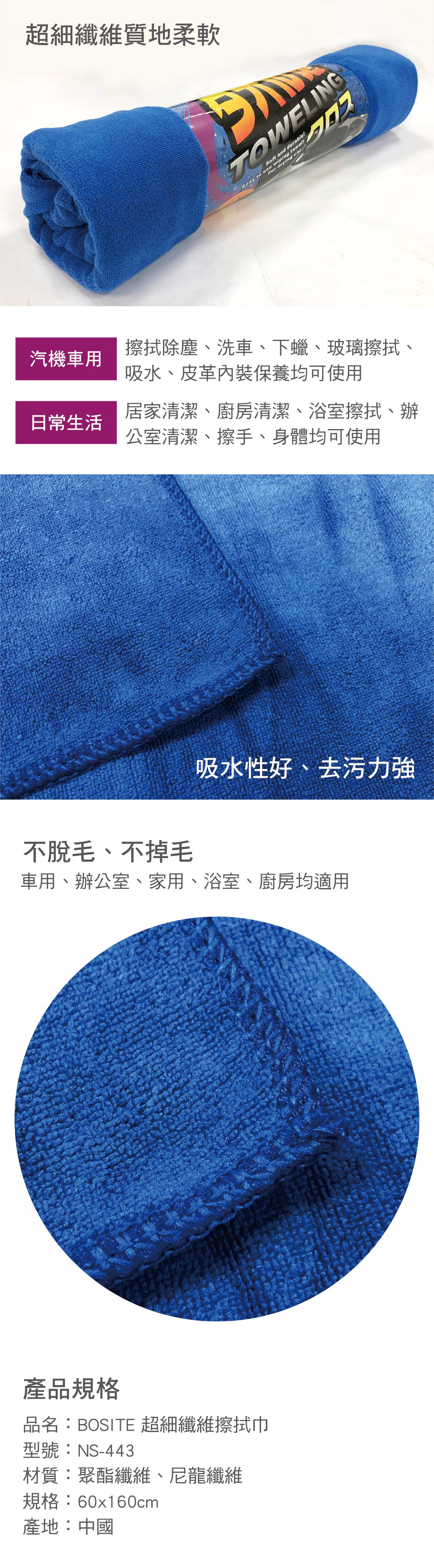 (1)超細纖維質地柔軟,能輕鬆清潔 (2)吸水性好、去污力強 (3)能有效率清潔,持久耐用 (4)柔軟親膚,舒適耐用 (5)不脫毛、不掉毛 (6)車用、辦公室、家用、浴室、廚房均適用