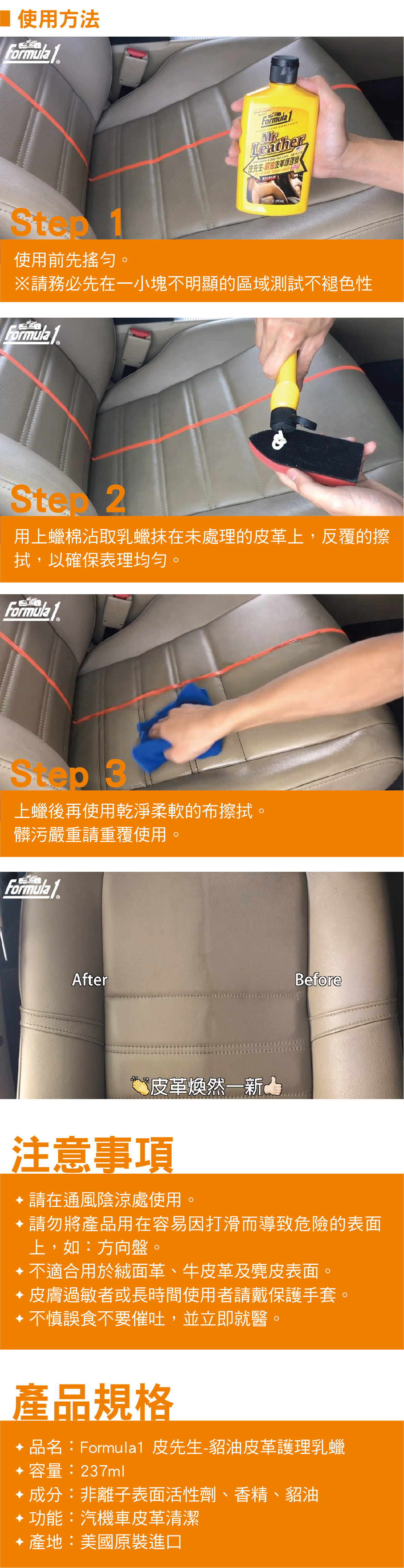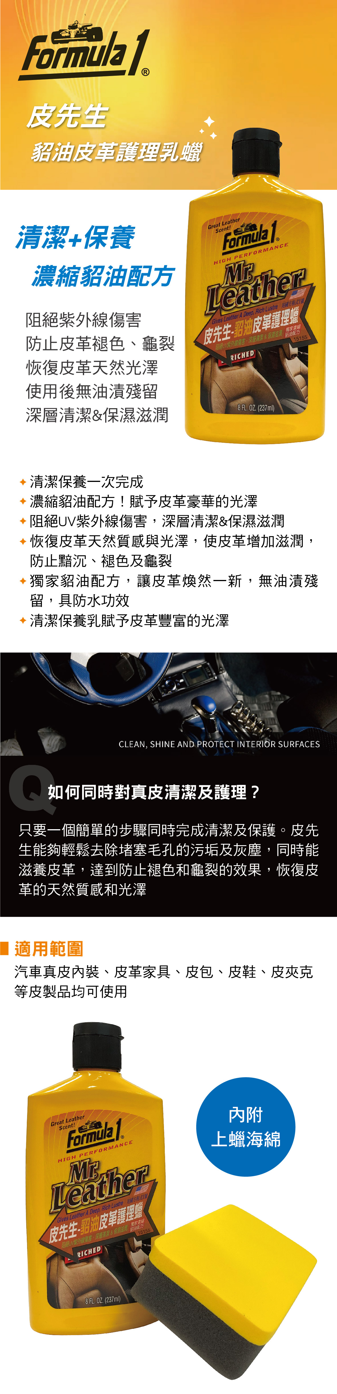 (1)清潔保養一次完成 (2)濃縮貂油配方!賦予皮革豪華的光澤 (3)阻絕UV紫外線傷害,深層清潔&保濕滋潤 (4)恢復皮革天然質感與光澤,使皮革增加滋潤,防止黯沉、褪色及龜裂 (5)獨家貂油配方,讓皮革煥然一新,無油漬殘留,具防水功效 (6)清潔保養乳賦予皮革豐富的光澤 (7)適用範圍:汽車真皮內裝、皮革家具、皮包、皮鞋、皮夾克