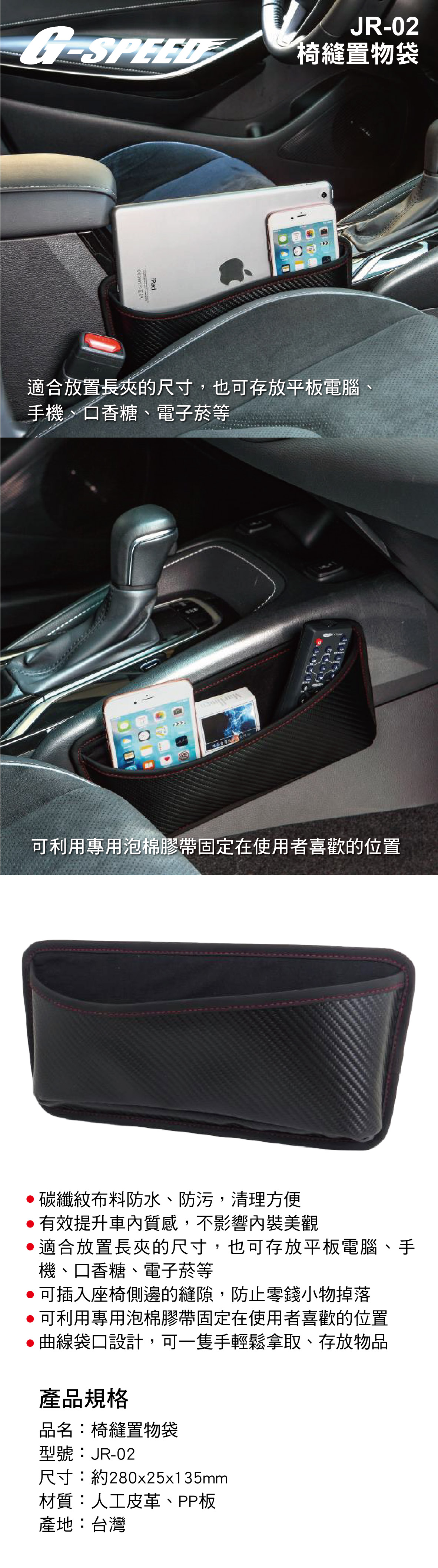 (1)碳纖紋布料防水、防污,清理方便 (2)有效提升車內質感,不影響內裝美觀 (3)適合放置長夾的尺寸,也可存放平板電腦、手機、口香糖、電子菸等 (4)可插入座椅側邊的縫隙,防止零錢小物掉落 (5)可利用專用泡棉膠帶固定在使用者喜歡的位置 (6)曲線袋口設計,可一隻手輕鬆拿取、存放物品