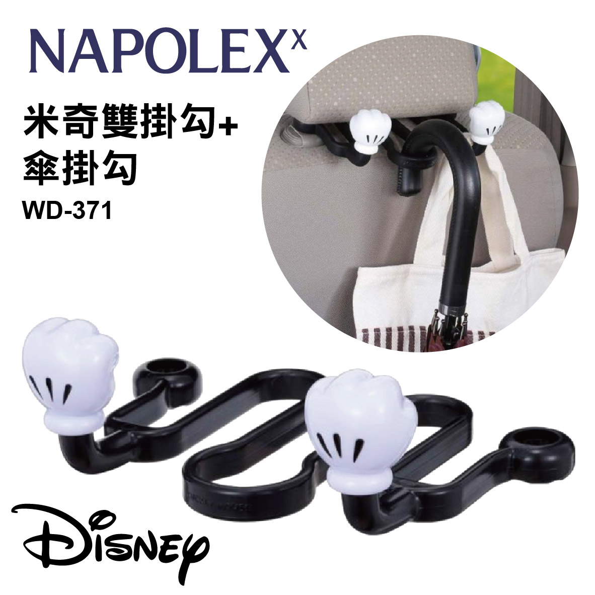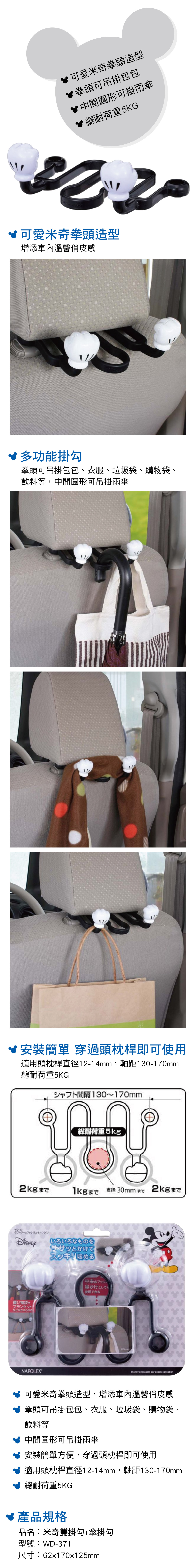 (1)可愛米奇拳頭造型,增添車內俏皮感 (2)拳頭可吊掛包包、衣服、垃圾袋、購物袋、飲料等 (3)中間圓形可吊掛雨傘 (4)安裝簡單方便,穿過頭枕桿即可使用 (5)適用頭枕桿直徑12-14mm,軸距130-170mm (6)總耐荷重5KG