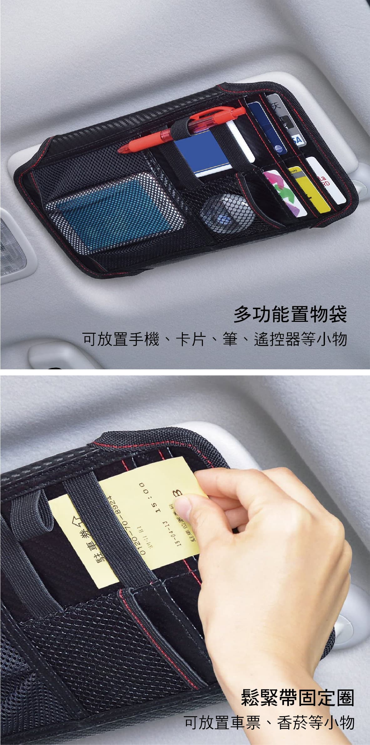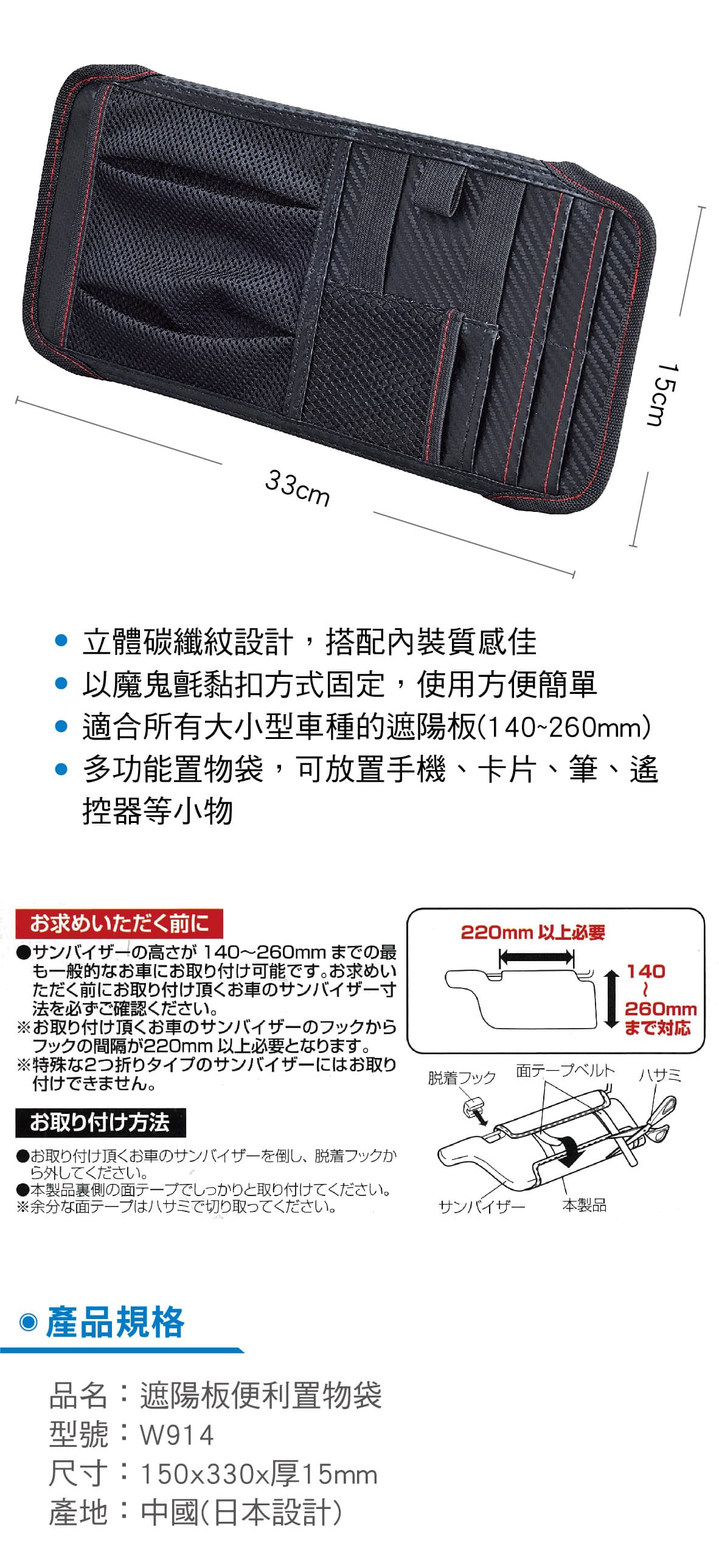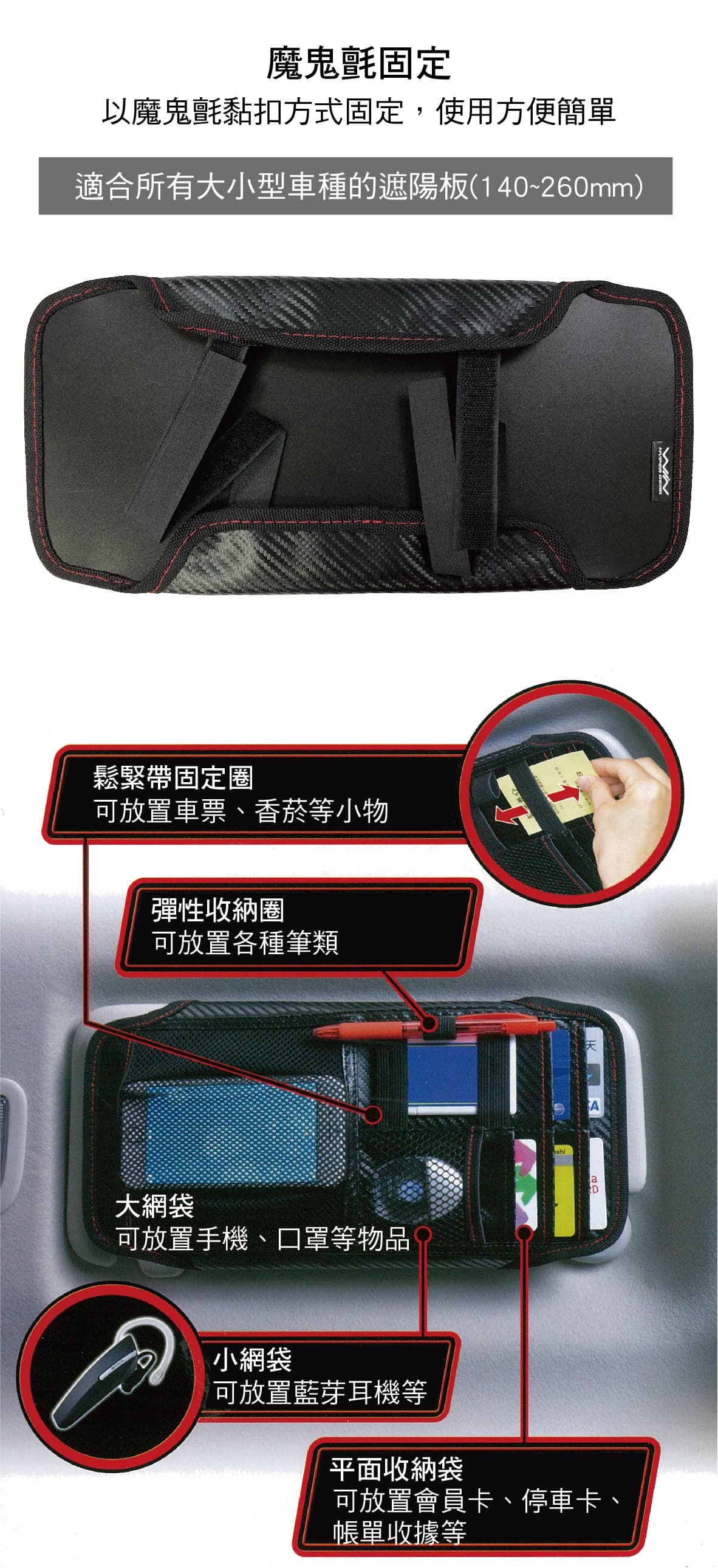 (1)立體碳纖紋設計,搭配內裝質感佳 (2)以魔鬼氈黏扣方式固定,使用方便簡單 (3)適合所有大小型車種的遮陽板(140~260mm) (4)多功能置物袋,可放置手機、卡片、筆、遙控器等小物