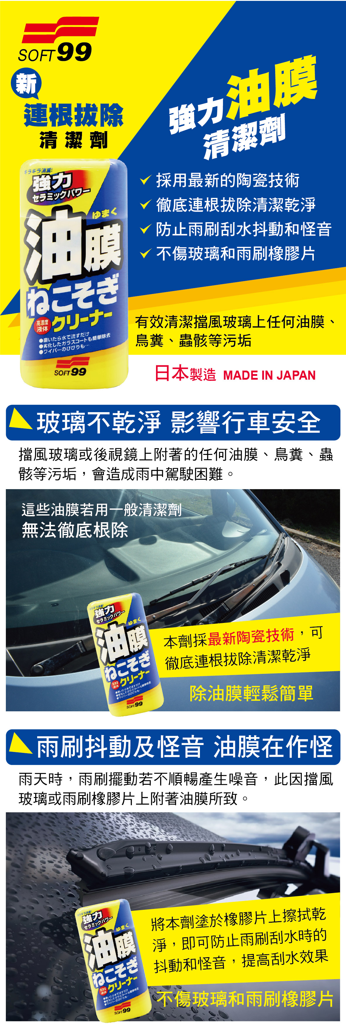 (1)採用最新的陶瓷技術 (2)可以徹底連根拔除清潔乾淨 (3)可防止雨刷刮水時的抖動和怪音 (4)絕不傷及玻璃和雨刷橡膠片 (5)使用方法簡單快速