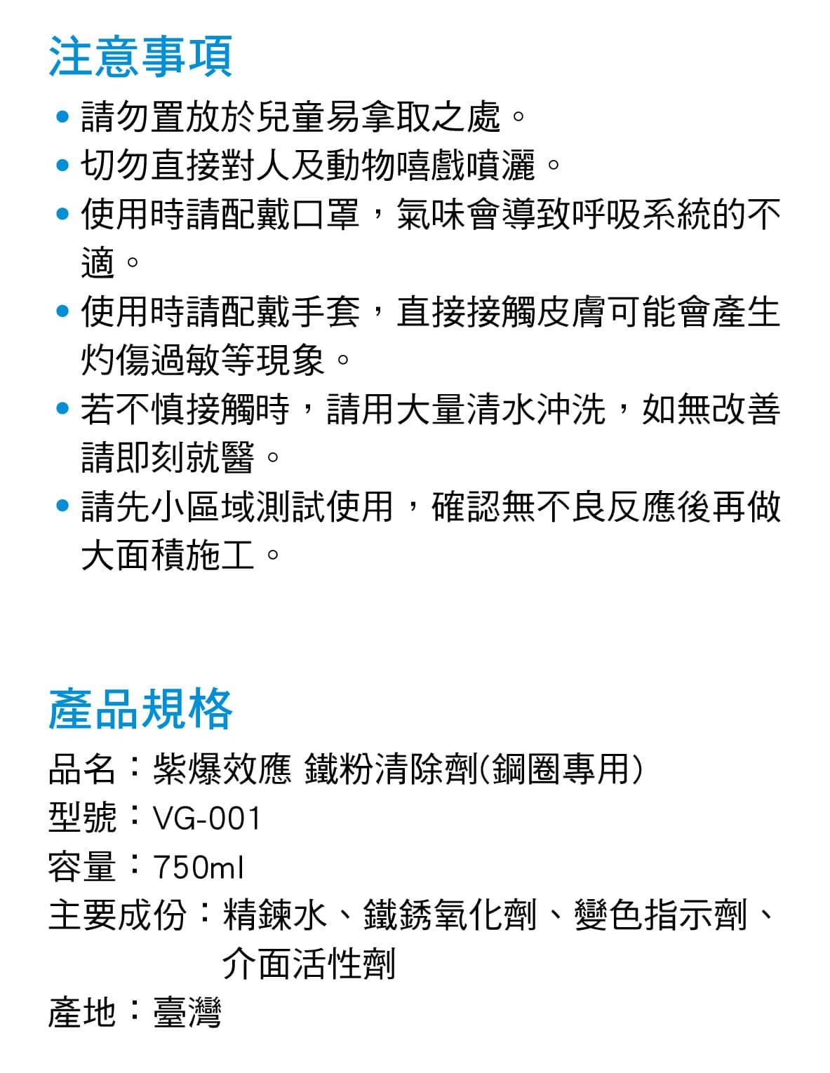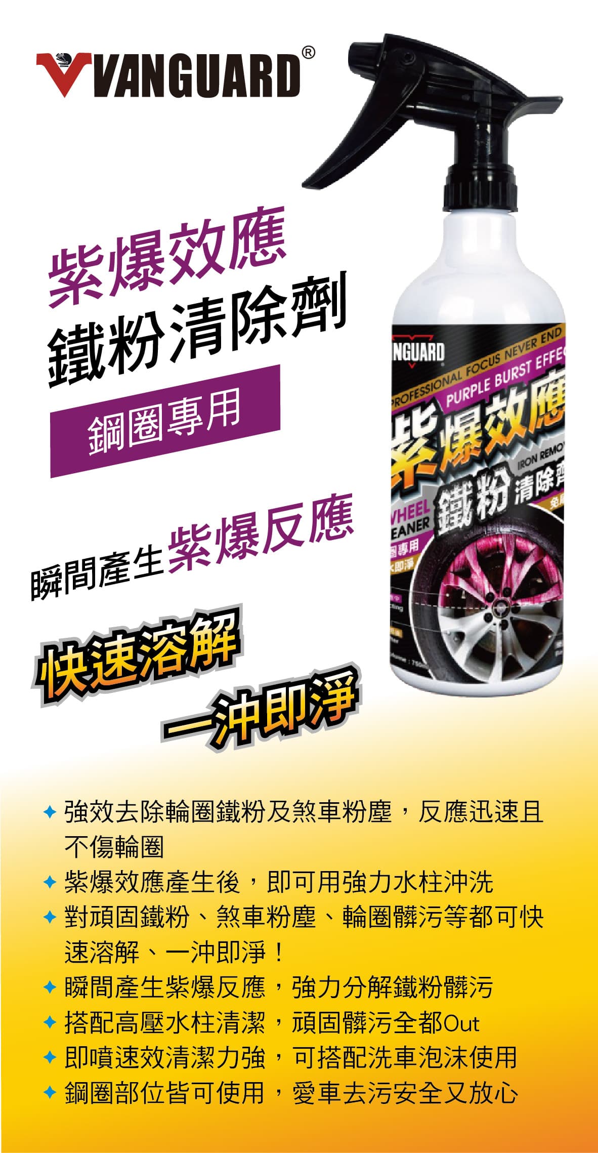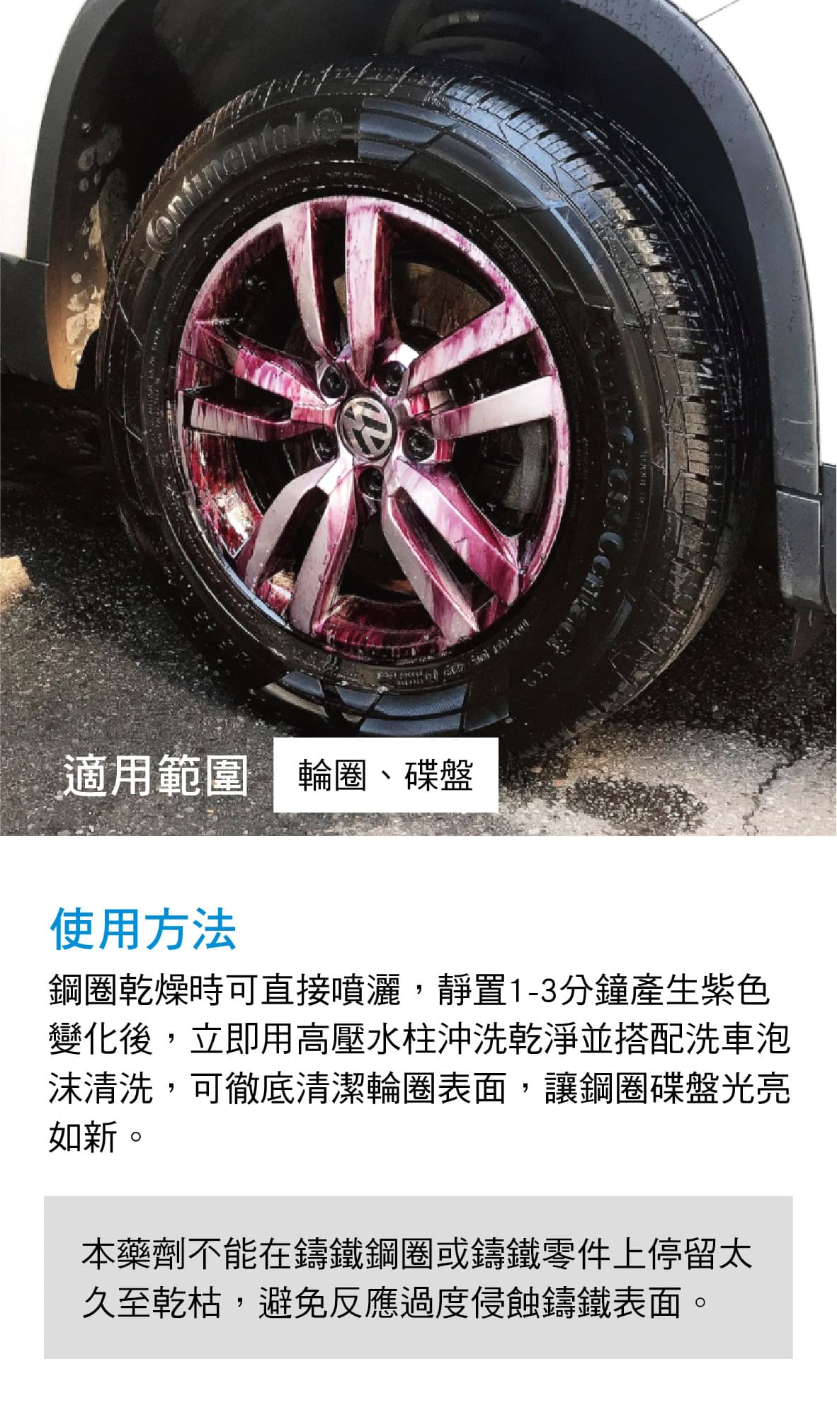 (1)強效去除輪圈鐵粉及煞車粉塵,反應迅速且不傷輪圈 (2)紫爆效應產生後,即可用強力水柱沖洗 (3)對頑固鐵粉、煞車粉塵、輪圈髒污等都可快速溶解、一沖即淨! (4)瞬間產生紫爆反應,強力分解鐵粉髒污 (5)搭配高壓水柱清潔,頑固髒污全都Out (6)即噴速效清潔力強,可搭配洗車泡沫使用 (7)鋼圈部位皆可使用,愛車去污安全又放心